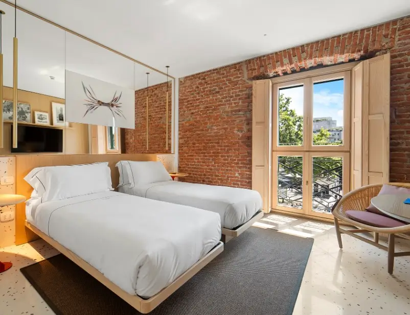 One of the most compelling aspects of Hotel Milù Milano is its architectural integrity. The building retains elements of its original structure, most notably through exposed brick walls that anchor the interiors in a tangible sense of history. These surfaces are not treated as decorative features, but as integral components of the space.