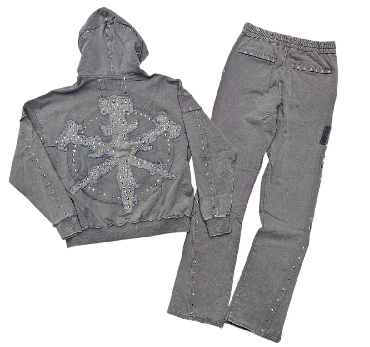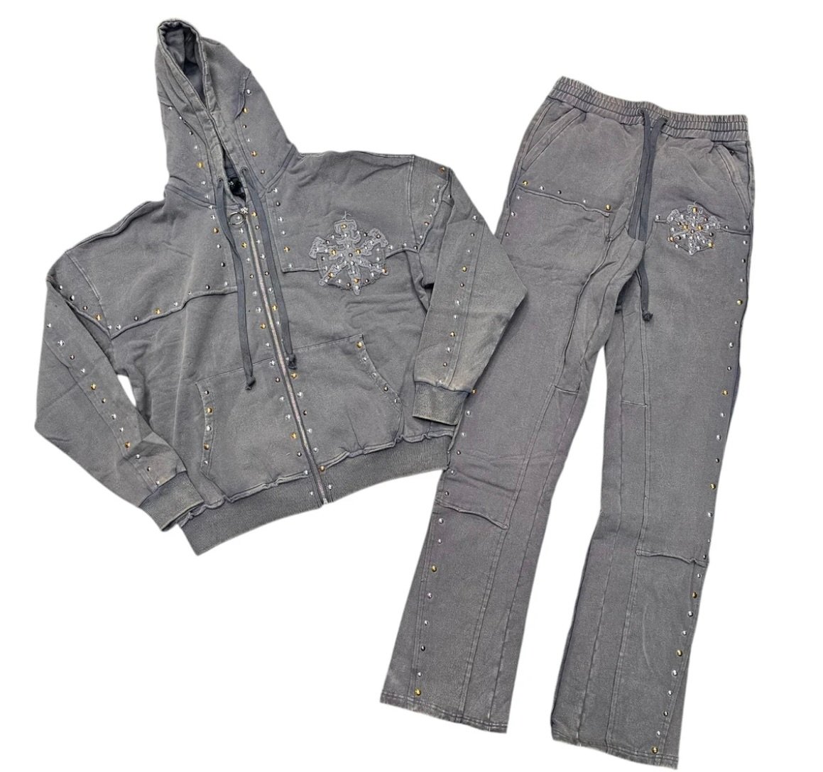 Streetwear thrives on blurring lines: casual becomes couture, and comfort becomes performance. The Hudson Studded Fleece Stacked Sweatsuit in gray embodies this shift, transforming the sweatsuit from background attire into a statement of personality. Built for ease yet sharpened with studs and a stacked silhouette, it balances softness with strength.