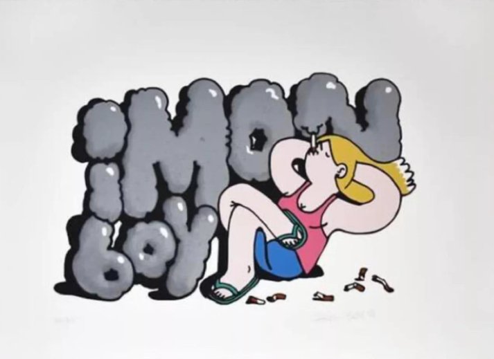 Hailing from Málaga, Spain, Imon Boy is part of the newer generation of urban artists who split their time between streets and galleries. His roots are graffiti—quick tags, coded messages, public surfaces—but his studio work takes that raw language and filters it through introspection and pop culture fluency.