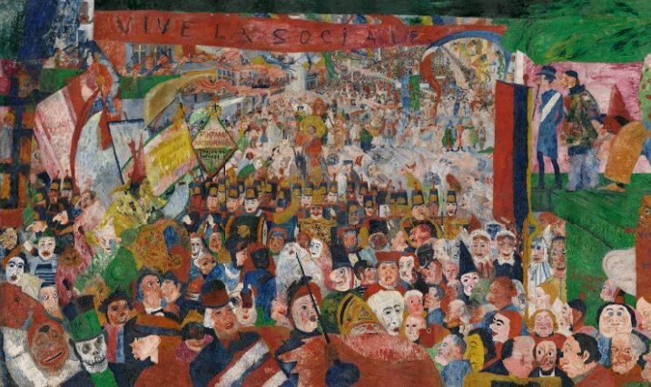The use of masks and caricatures in the painting serves as a powerful symbol of the falsehoods and deceptions that permeate society. By depicting the crowd as a masquerade, Ensor underscores the idea that individuals hide their true selves behind facades of respectability and piety. The painting’s chaotic and crowded composition further reinforces the sense of disorder and confusion that defines the modern world.
