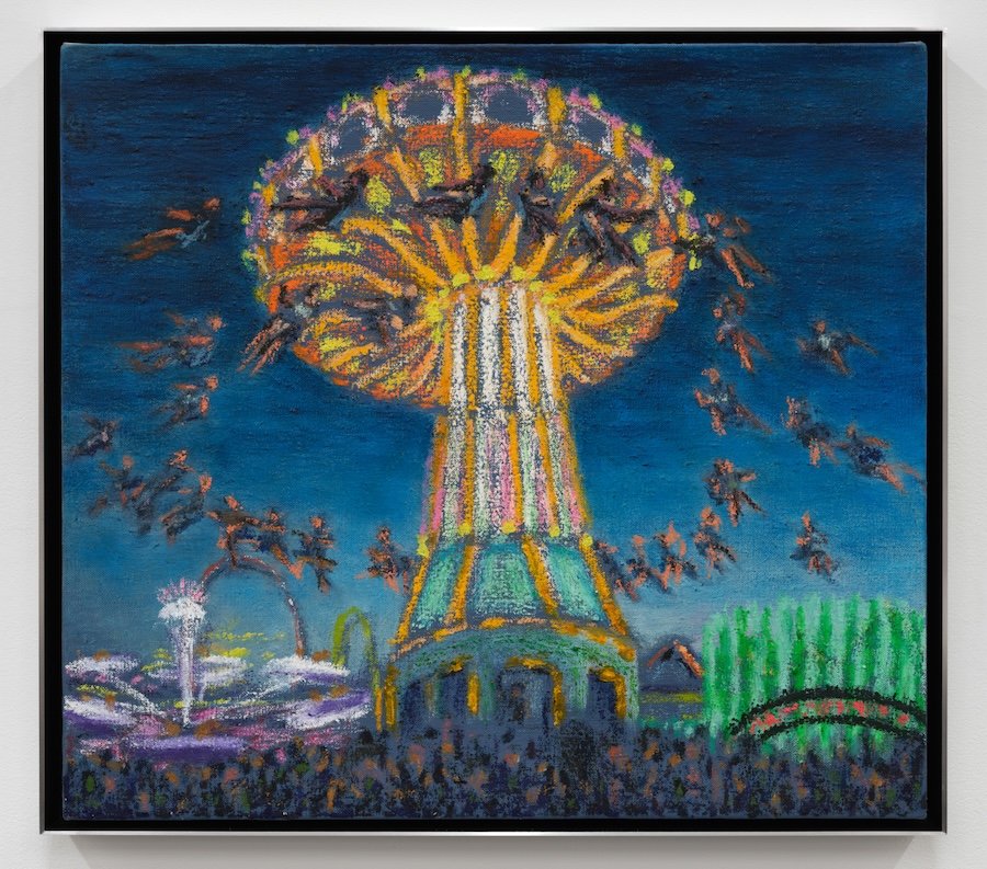 In interviews, Dickson has spoken about her interest in how we “internalize the city,” transforming external structures into intimate psychological landscapes. This painting is a perfect example: it’s not a literal depiction of a ride but rather a mental snapshot of what the experience feels like—dizzying, bright, and just out of reach.