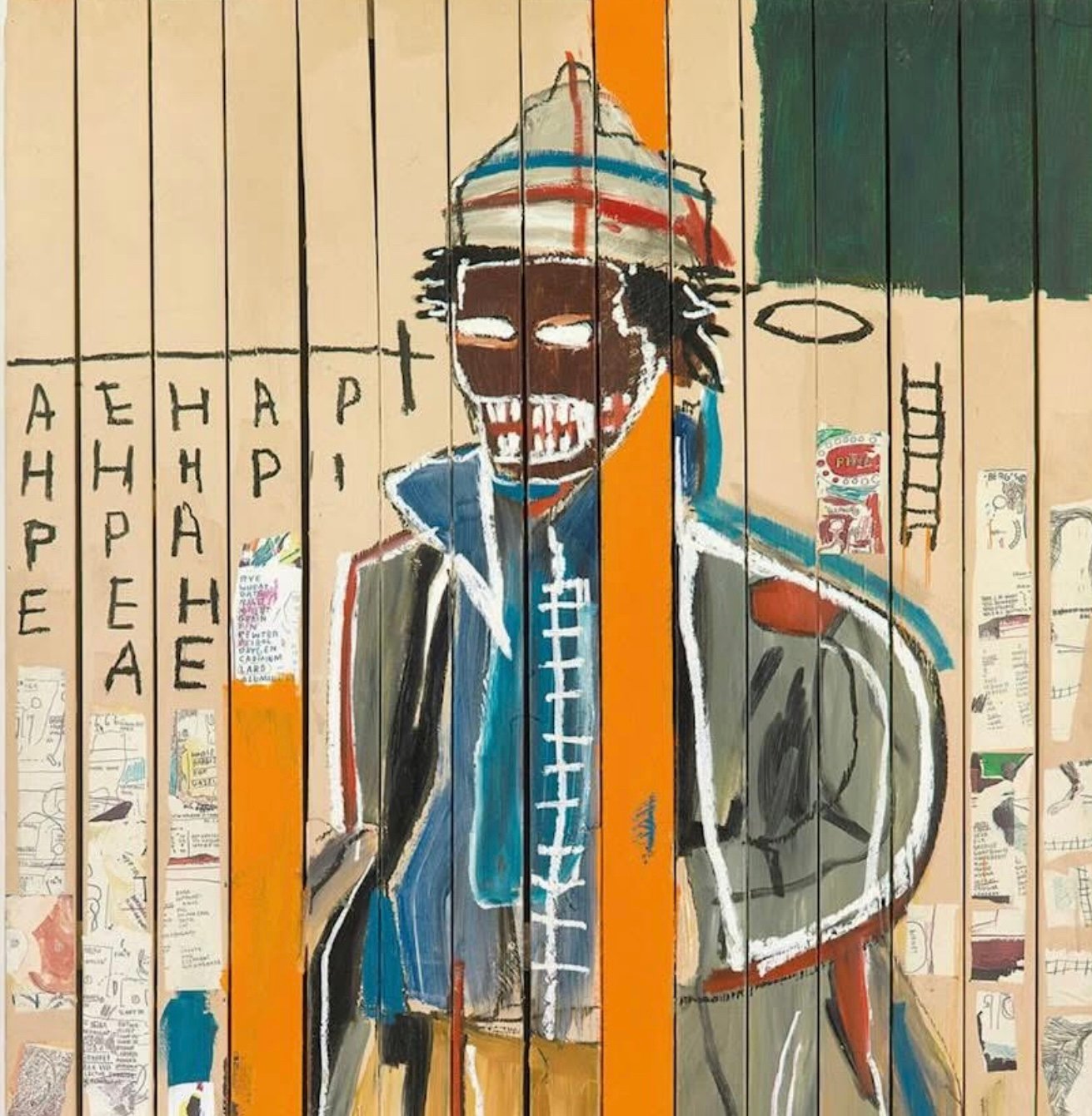 In Anthony Clarke, the title itself suggests an individual subject, though Basquiat’s figures often transcend literal representation. Whether Clarke was a historical figure, a friend, or an alter ego remains uncertain, but the name serves as a focal point that invites interpretation. Basquiat’s paintings frequently memorialize Black heroes—ranging from athletes like Jack Johnson to musicians like Charlie Parker. If Anthony Clarke follows this pattern, the subject could be an individual of significance within the African American community.