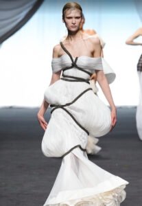 •Flowing, pleated gowns recall the undulating movement of seaweed, billowing and wrapping around the body like ocean waves.