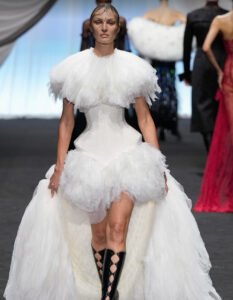 •Gaultier’s penchant for gender-fluid fashion is brilliantly executed, with tailored jackets morphing into corset dresses and masculine elements juxtaposed against ultra-feminine drapery.