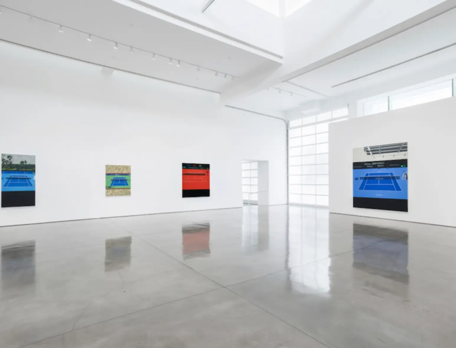 The exhibition centers on a suite of tennis court paintings produced across 2025 and 2026, extending a series Wood initiated in 2011. What might initially read as a thematic pivot toward sport reveals itself, upon closer inspection, as a continuation of Wood’s sustained inquiry into systems of looking. Tennis, in this context, is not subject but structure—a preexisting viewed grammar that allows the artist to test repetition, variation, and abstraction within tightly controlled limits.