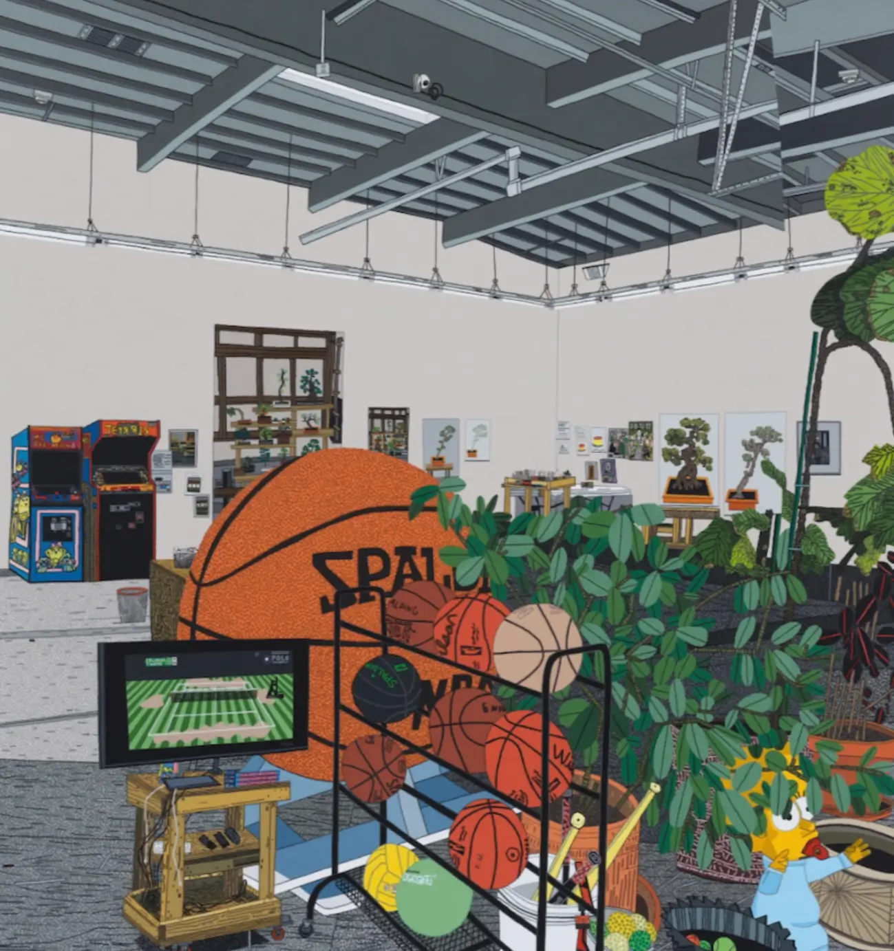 The inclusion of basketball—a recurring motif in Wood’s practice—alongside tennis underscores the continuity of his interests. Sport, in this context, is not a departure but an extension of an existing saw vocabulary. The studio acts as a nexus where different image systems intersect, reinforcing the idea that contemporary painting operates within a network of references rather than in isolation.