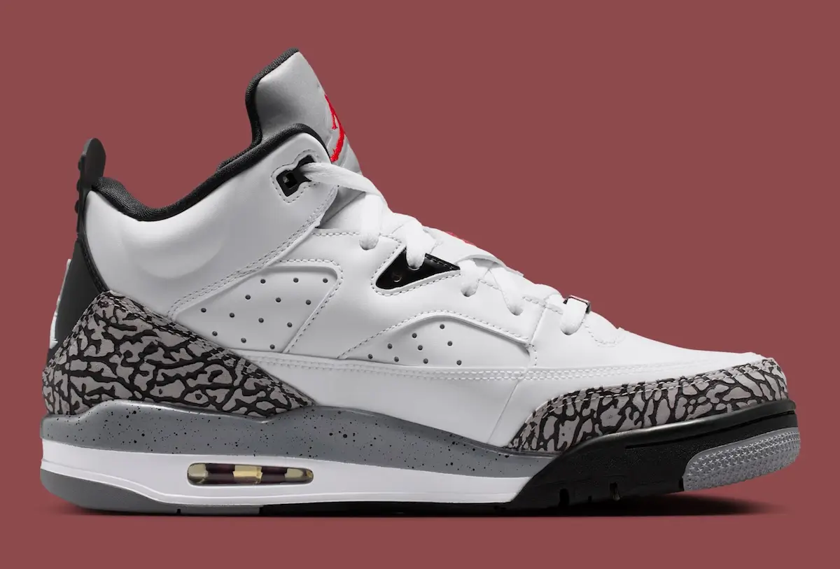 The “White Cement” execution amplifies that concept. A clean white leather base acts as the canvas, while cement grey elephant print wraps the toe and heel—arguably the most recognizable view code in Jordan history. Black accents provide contrast, and hits of varsity red punctuate the design, echoing the classic Chicago Bulls palette.