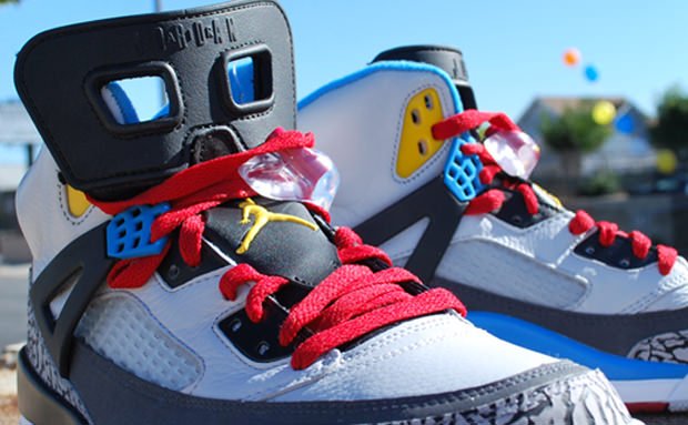 The Jordan Spizike ‘Bordeaux’ boasts a primarily white leather upper with a unique blend of Varsity Maize, Dark Shadow, Varsity Red, and University Blue accents. Key design elements include: