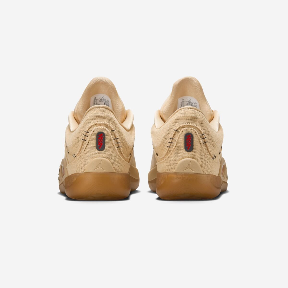 The shoe features a Sesame / Gum Light Brown / Black / Flash Crimson palette that feels earthy yet eye-catching. The upper’s canvas-like texture, reminiscent of burlap, establishes a raw, organic look. This is accentuated by exposed black stitching that appears to hold panels together like patches on a doll or a hand-sewn relic. Against this rough base, flashes of crimson branding and heel details create sparks of color, ensuring the shoe isn’t subdued but alive with contrast.