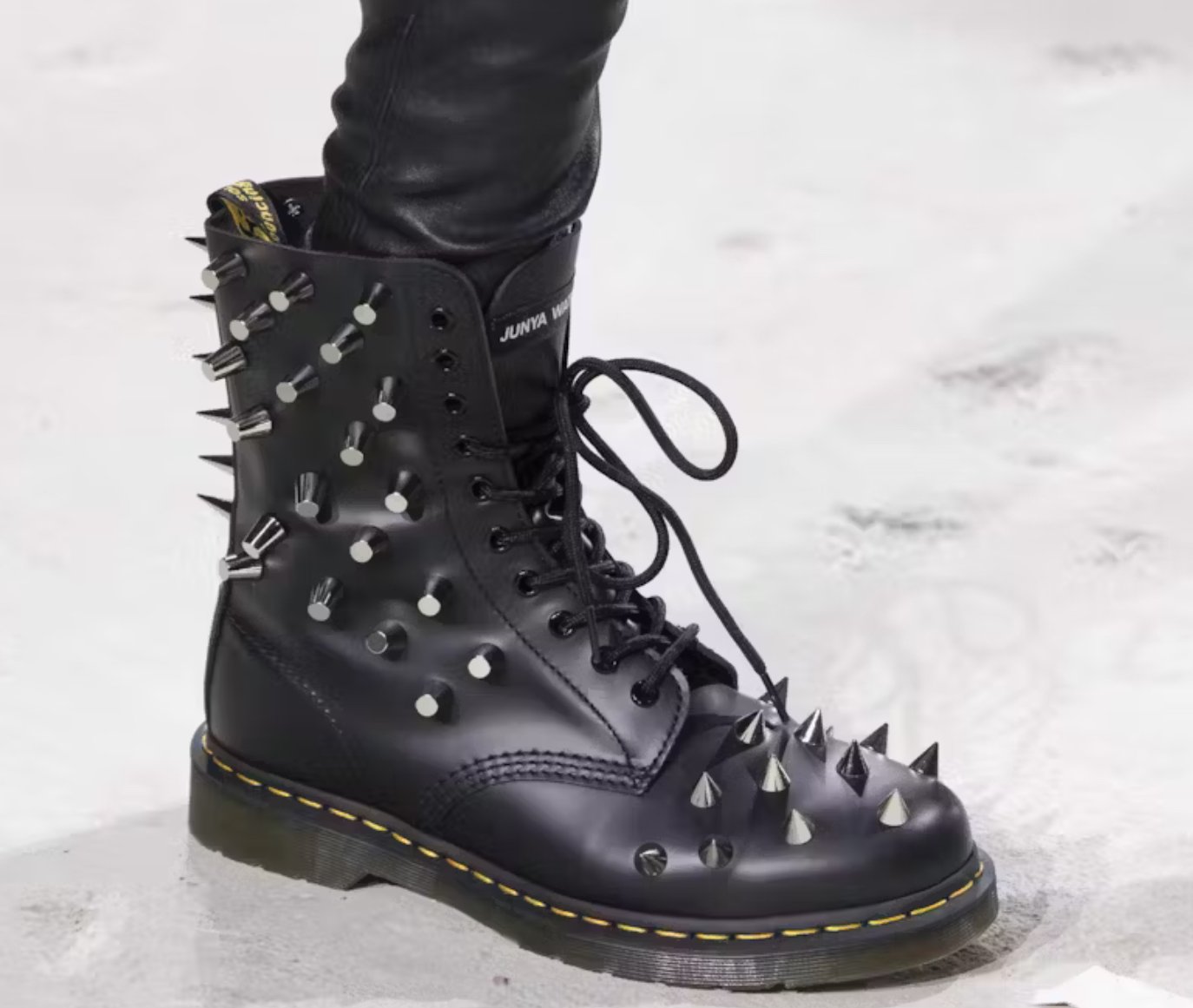 At the Paris Fashion Week show, these boots were styled as integral parts of Watanabe’s FW25 looks. Models wore them with oversized, sharply angled coats, military-style jackets, and denim pieces that were cut into puzzle-like panels. The visual impact was stark: the boots anchored the futuristic designs, giving them a grounding in punk’s lived-in legacy. In motion, the studs caught light, glinting beneath deconstructed hems and sculptural folds.