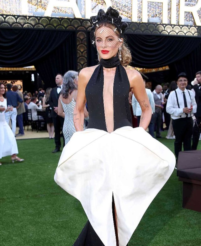 Beckinsale graced the red carpet in a stunning backless ball gown designed by renowned French couturier Stéphane Rolland. The gown featured a structured black and white organza mini skirt, a sweeping train, and delicate glittery details that shimmered under the lights. The most striking aspect of the gown was its barely-there back, which showcased Beckinsale’s tattooed figure and toned physique.