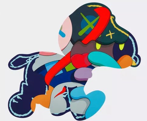 – Characters and Symbolism: The work prominently includes figures similar to KAWS’ recurring character “Companion”, a figure that blends aspects of cartoon icons like Mickey Mouse with an existential undertone.