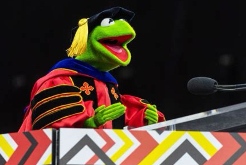 In his speech, Kermit nodded to the school’s Terrapin mascot, joking, “I may be a frog, but I’ve always admired a good shell game,” before turning serious: