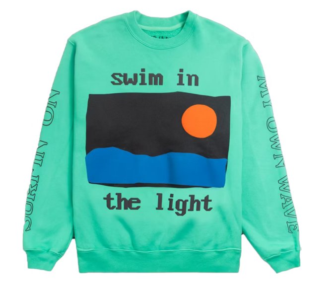 The “Swim In The Light” crewneck stands out not only for its association with iconic names but also for its design. The teal colorway is both bold and refreshing, deviating from the more conventional hues often seen in streetwear. This choice of color symbolizes a sense of tranquility and introspection, qualities that are frequently associated with Kid Cudi’s music. His work often delves into themes of mental health, self-discovery, and emotional vulnerability, making the color teal an apt representation of the soothing and reflective nature of his art.