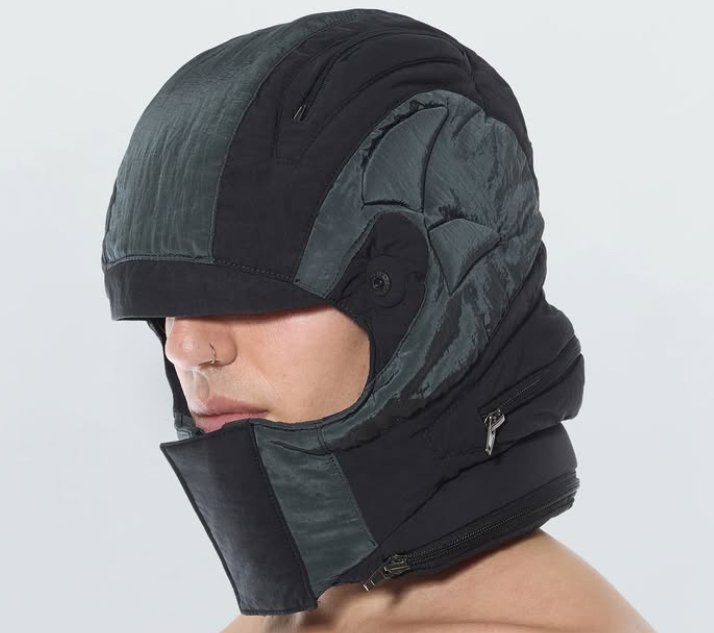 Styling this cap can be an exciting challenge, as it complements a range of looks from sleek, monochromatic outfits to more layered, avant-garde ensembles. Paired with oversized outerwear, technical fabrics, and structured silhouettes, it enhances the futuristic aesthetic Kusikohc is known for. Whether worn with streetwear staples like hoodies and cargo pants or integrated into high-fashion ensembles, the Helmet Cap stands out as a conversation-starting piece.