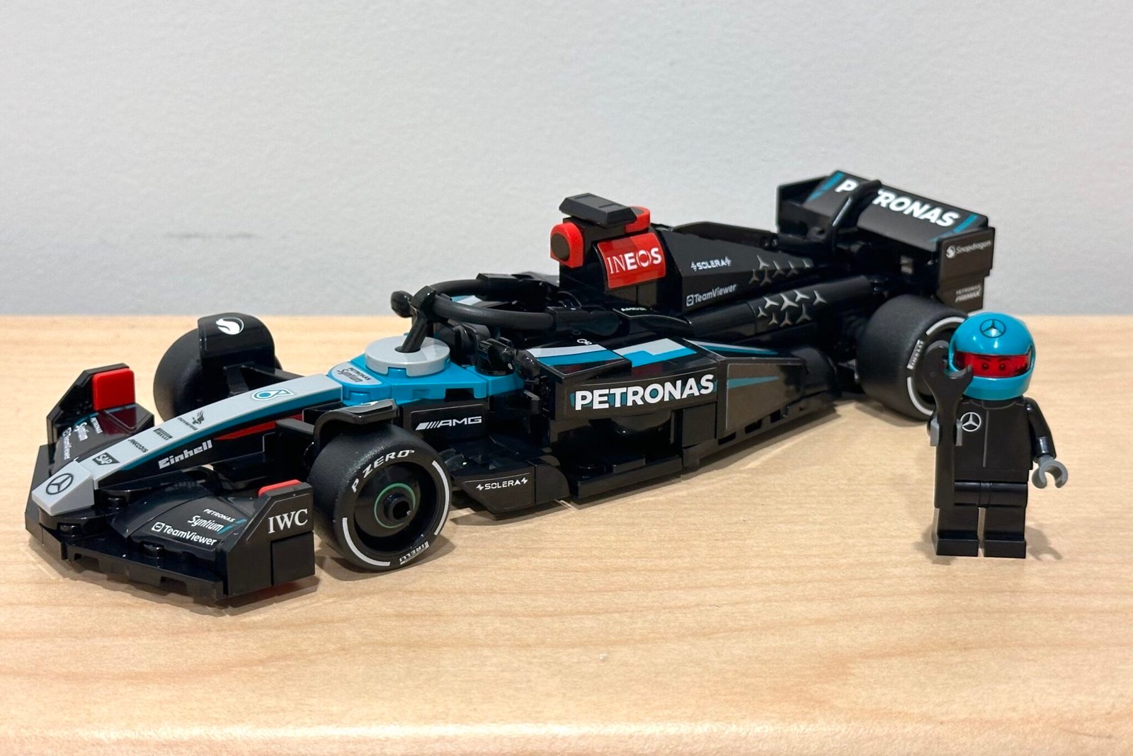 - Minifigure driver in full Mercedes-AMG racing gear, complete with the Petronas logo and sponsors.