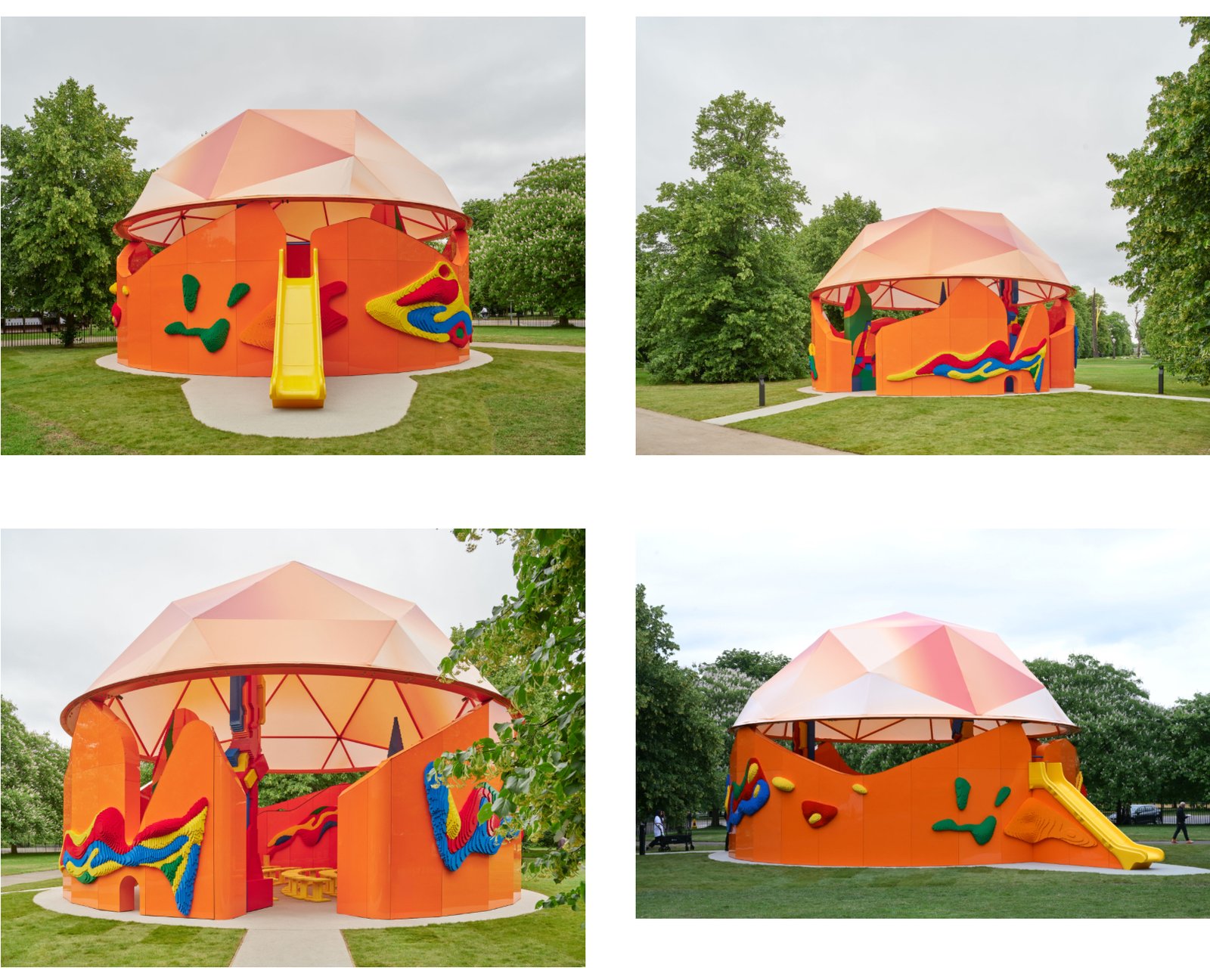 Built largely from life-sized LEGO-inspired forms and LEGO-compatible materials, the Pavilion blurs the line between sculpture and shelter. It is as much a functional venue as it is a monument to creative play. Domes made of translucent blocks allow sunlight to refract in rainbow hues across the interior, while geometric columns twist like DNA strands, holding up canopies shaped like exploded diagrams of bricks.