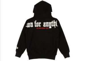 Cut from heavyweight cotton with fleece-lined interior, the hoodie maintains a classic streetwear build: ribbed cuffs, kangaroo pouch, a relaxed fit that emphasizes volume without slouch. It’s not slim. It doesn’t taper to the body. It lets the text do the shaping.