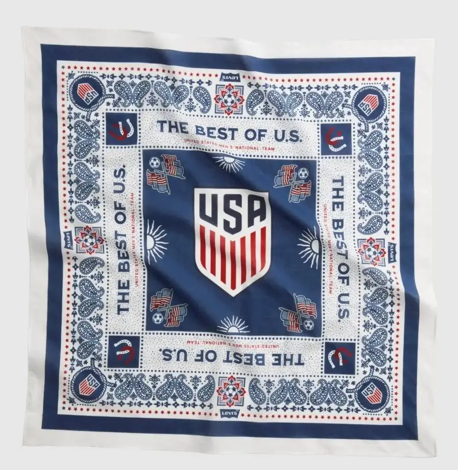 Printed with the U.S. Soccer crest and subtle Levi’s branding, the bandana operates across environments. It can exist at the neck, on a wrist, tied to a bag, or folded into a back pocket. It doesn’t prescribe its own use. That openness is its strength. It mirrors the way fans engage with sport—not through a single uniform, but through countless personal adaptations.