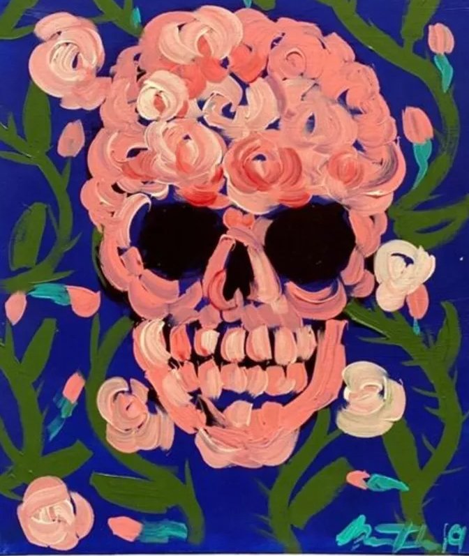Little Skull on Blue (2019) by Bradley Theodore is a masterful example of how contemporary artists are reinventing traditional motifs to address universal themes. Through its vibrant colors, dynamic composition, and rich symbolism, the piece invites viewers to reflect on the interconnectedness of life and death, the fluidity of identity, and the beauty of impermanence.