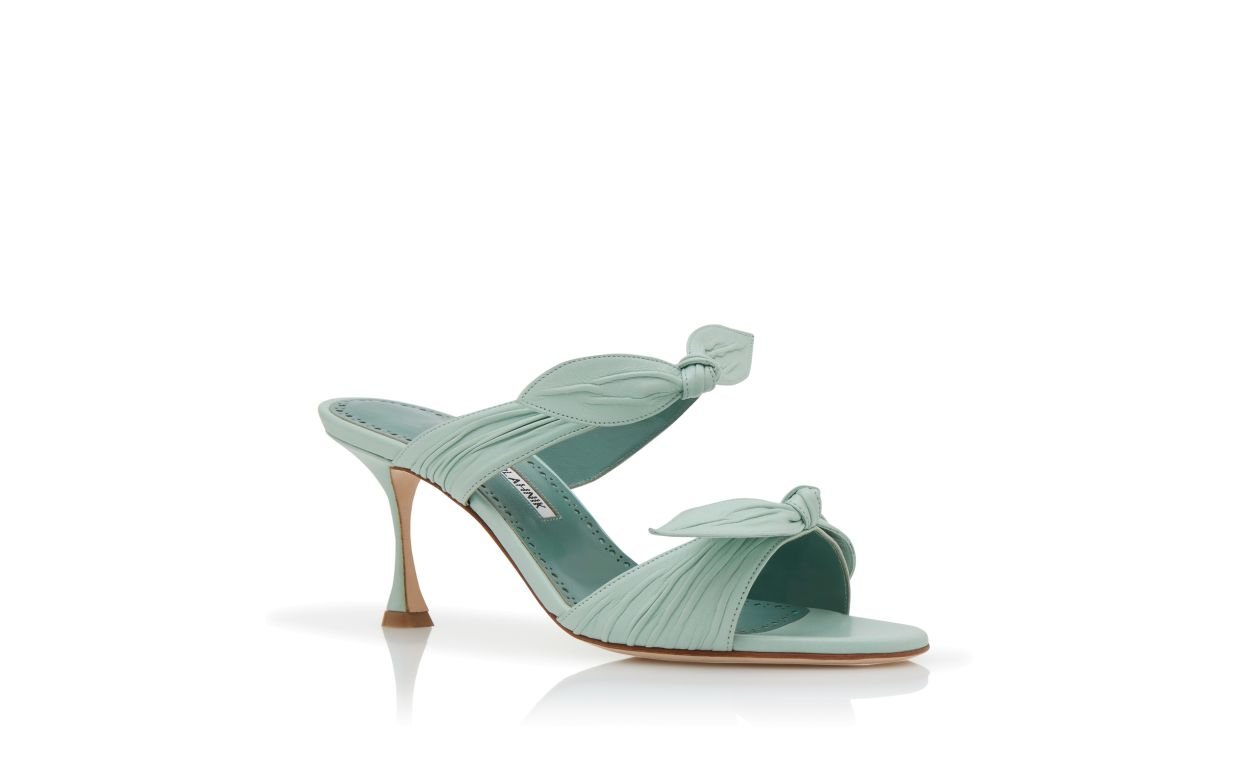 Step into the world of sophisticated style and unparalleled comfort with the Lollo Light Green Nappa Leather Bow Detail Mules, a stunning creation by the iconic footwear designer Manolo Blahnik. These mules effortlessly combine form and function, making them a versatile addition to any wardrobe.