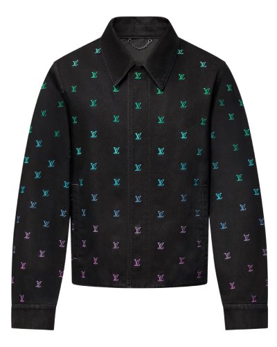 The Louis Vuitton Blason Coach Jacket is a stylish and sophisticated garment crafted in washed black denim. This casual coach jacket features an allover embroidered LV Blason motif in a sophisticated gradient treatment, with pop colors fading from aqua to shades of green, blue, and violet.