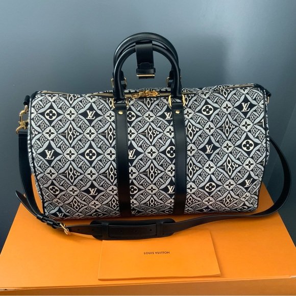 The “Since 1854” collection celebrates the founding of Louis Vuitton by incorporating a jacquard fabric design that intertwines the year 1854 with the iconic monogram motif. The Keepall 45 features this unique tapestry-like pattern, creating a visually striking aesthetic that is instantly recognizable. The motif, crafted in neutral tones, is a nod to the brand’s heritage, yet feels contemporary, appealing to both classic and modern sensibilities.