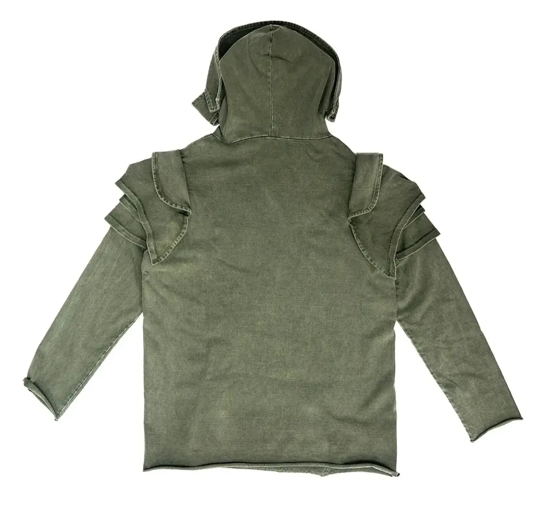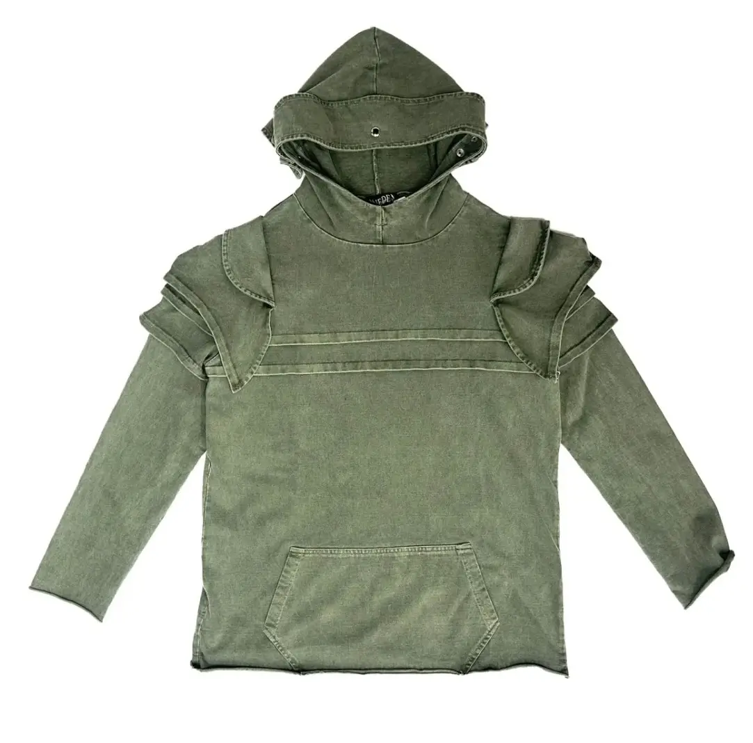 In this way, the Khaki Knight Hoodie becomes a study in psychological protection. It doesn’t shield the body from impact; it reframes how the body is perceived.