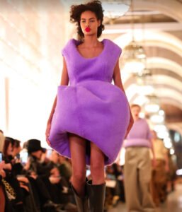 One of the defining features of Jacobs’ Spring 2025 collection was its dramatic use of proportions. Models appeared as if they had stepped out of a couture fairytale, donning voluminous skirts, ballooning sleeves, and exaggerated shoulder pads. These oversized shapes were contrasted with sharply defined waists, creating a striking visual effect reminiscent of classic couture but with a distinctly modern twist.