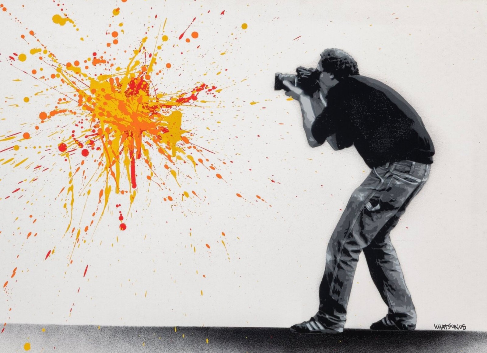 Moreover, the juxtaposition raises questions about the authenticity of art and representation. In an age where images are endlessly reproduced, edited, and commodified, Whatson subtly critiques our relationship with images. The splatter remains untamable; even as the photographer attempts to “own” it through his lens, its vibrancy resists confinement.