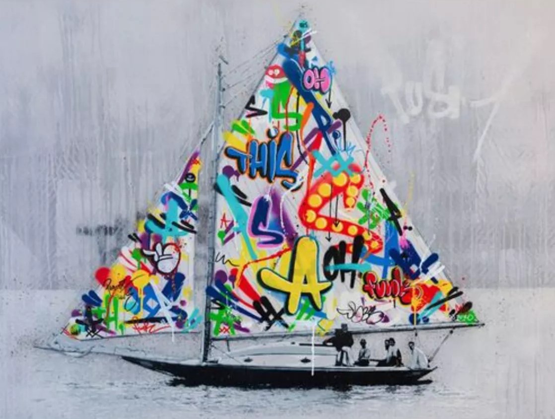 Few artists manage to seamlessly merge fine art and street art without one overpowering the other. Whatson’s work retains the integrity of both styles, ensuring that neither the sailboat’s elegance nor the graffiti’s energy is lost.