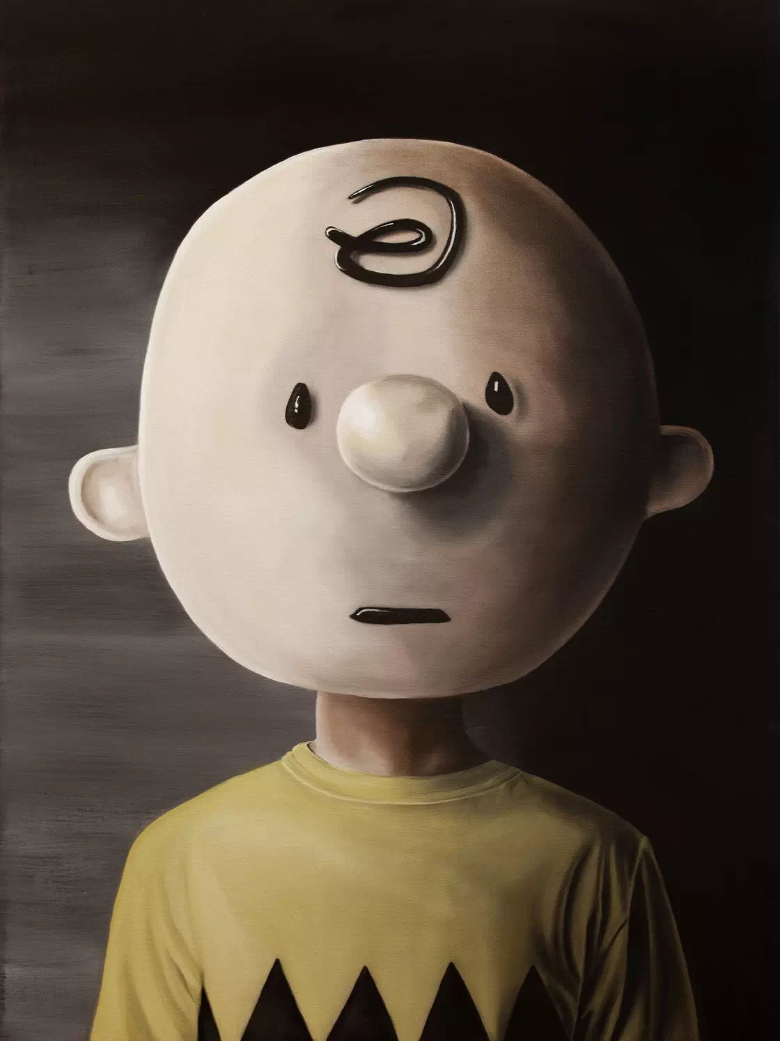 Gregory Malphurs’ Mask No. 17 takes one of the most recognizable faces in American culture — Charlie Brown from Charles Schulz’s Peanuts — and transforms it into something quietly devastating. The child whose round head once symbolized innocence, awkwardness, and optimism is here reimagined as an empty vessel. The painting depicts a boy wearing a rigid, oversized mask with a spiral of hair on his forehead, teardrop-shaped eyes, and a stiff-lipped expression. The yellow zigzag shirt leaves no doubt about the reference, yet everything familiar feels wrong. It’s as if Charlie Brown has been embalmed in melancholy.