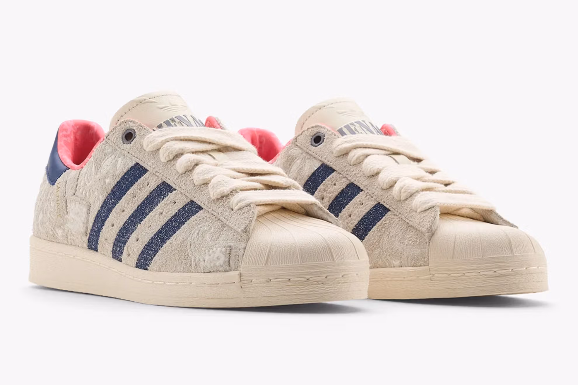 But the emotional heartbeat of the shoe lies within. The pink satin lining—soft, luminous, and unexpected—isn’t just decorative. Mena has shared that the color honors his mother’s favorite flower, the rose, and the resilience of his family. It also references the mattresses he and his siblings once slept on—simple details that now transform into the shoe’s emotional architecture. This texture of memory elevates the Superstar from product to personal artifact.