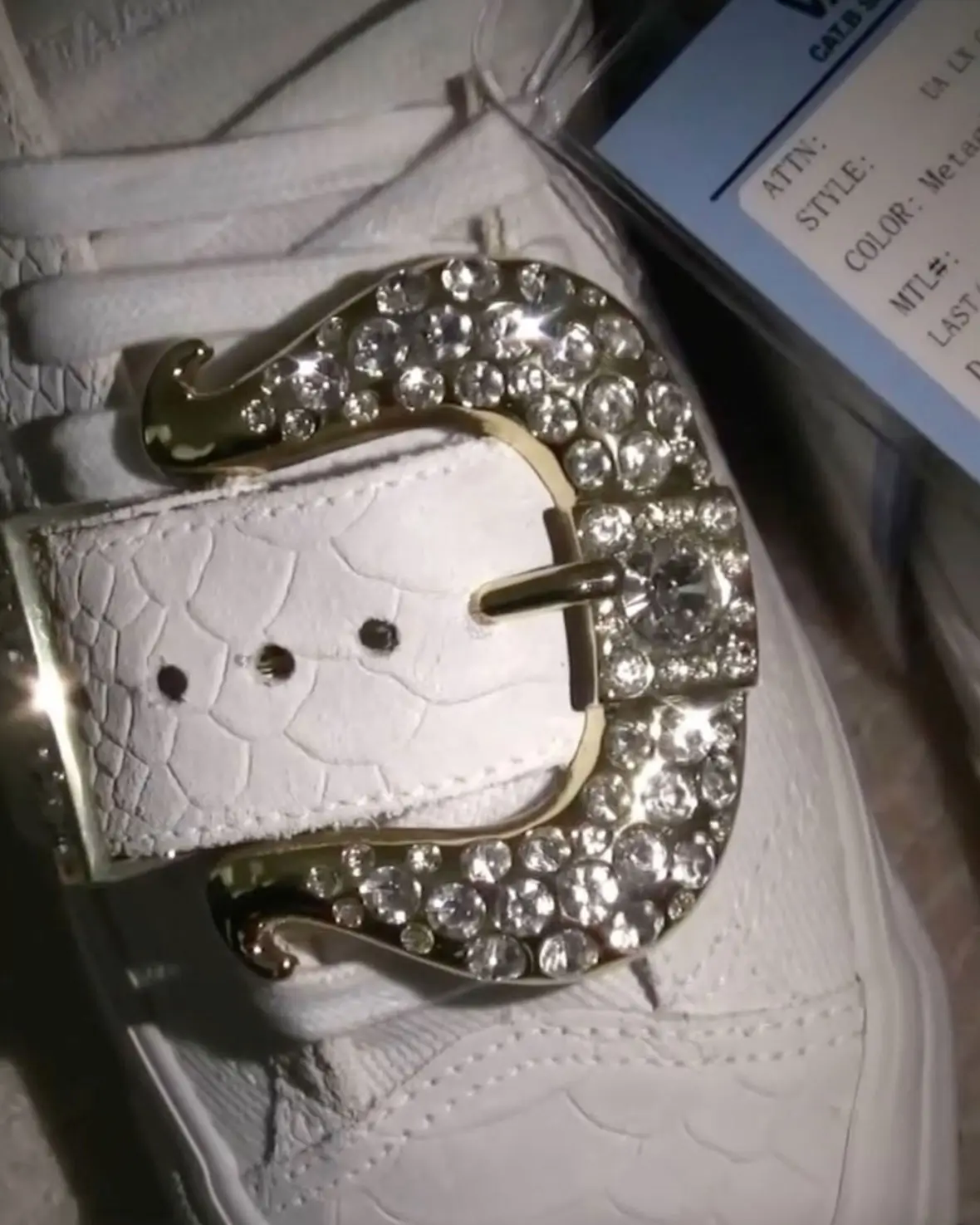 Early preview images suggest a stark white iteration reimagined in textured faux crocodile skin, disrupted by an oversized belt strap that cinches across the upper. Anchoring it all: a jeweled horseshoe buckle, exaggerated to the point of theatricality. The effect is immediate. It doesn’t ease the viewer in—it jolts.