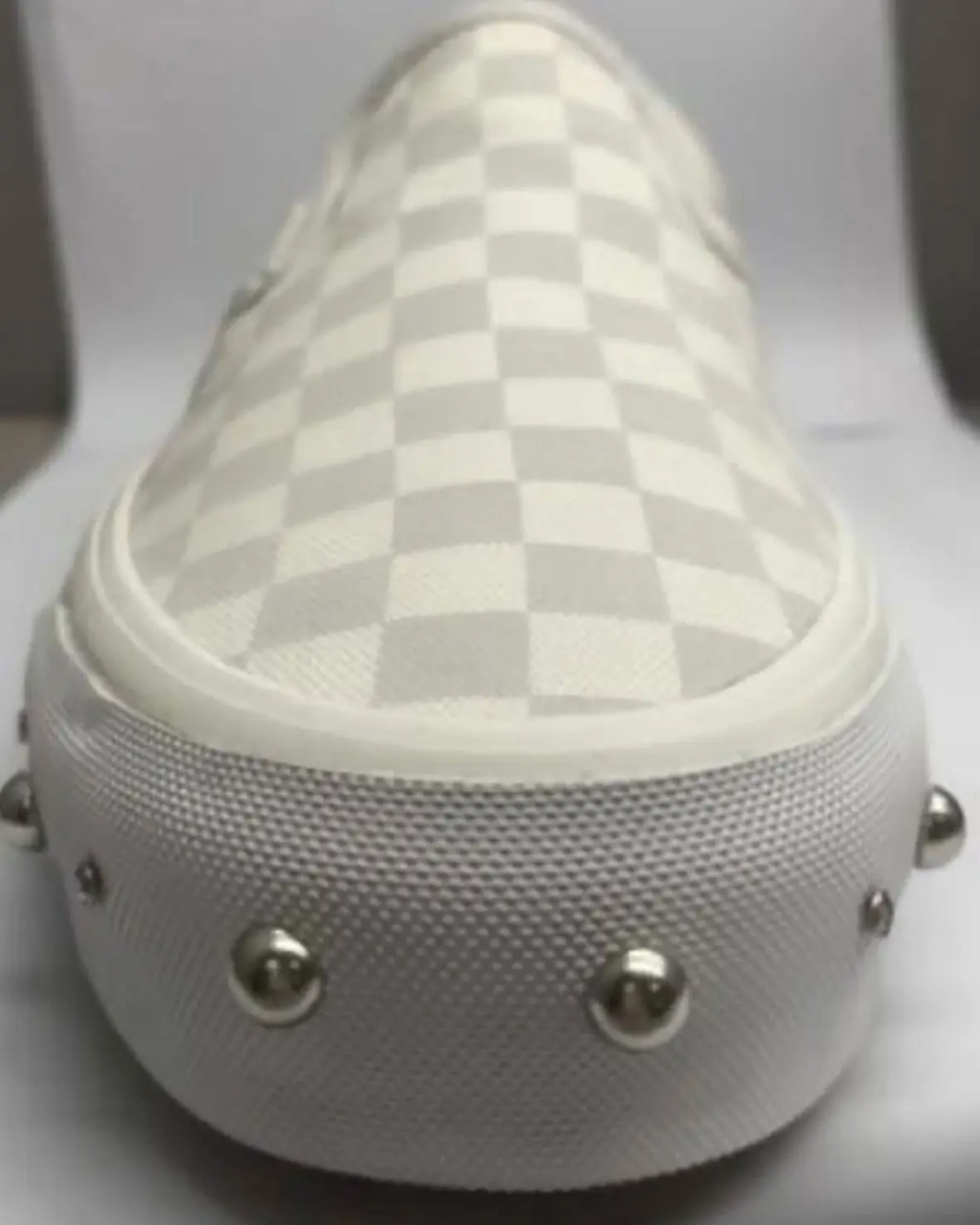 Its signature checkerboard remains intact, but the energy shifts. Metal studs are woven directly into the foxing, reframing the silhouette as something closer to armor than ease. The now-signature oversized strap returns, again crowned with the jeweled horseshoe, binding the collection into a singular visual language.