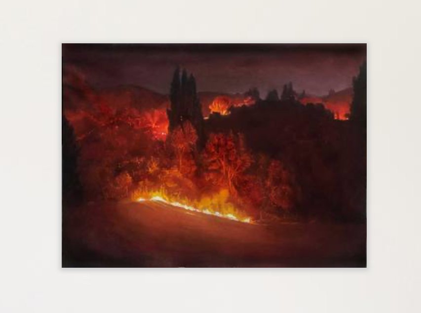 Wildfires have become a recurrent reality in California, a symbol of the broader consequences of climate change. In this context, Foulkrod’s painting is not just a landscape—it is a commentary. The encroaching fire can be read as both literal and symbolic: a force of nature, yes, but also a representation of the overlooked, slow-burning crises that threaten our constructed worlds—environmental neglect, political inertia, and the illusion of invincibility in the face of nature’s power.
