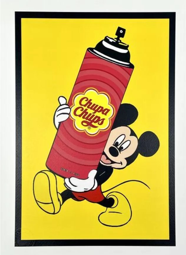 Mickey Chupa Spray (2020) is a limited-edition print that features Mickey Mouse, arguably the most recognizable character in the world, holding a spray can designed to resemble a Chupa Chups lollipop. The artwork is printed on fine art archival paper and is part of a series of 100 signed editions, along with a few artist proofs.