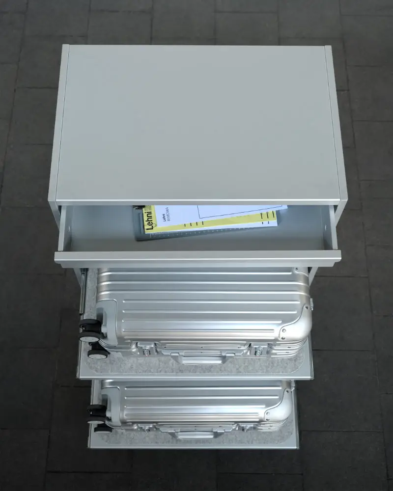 The Bench and Drawer—constructed from anodised aluminium—extended the logic of travel into the home. Suitcases became architectural elements. Storage became structure.