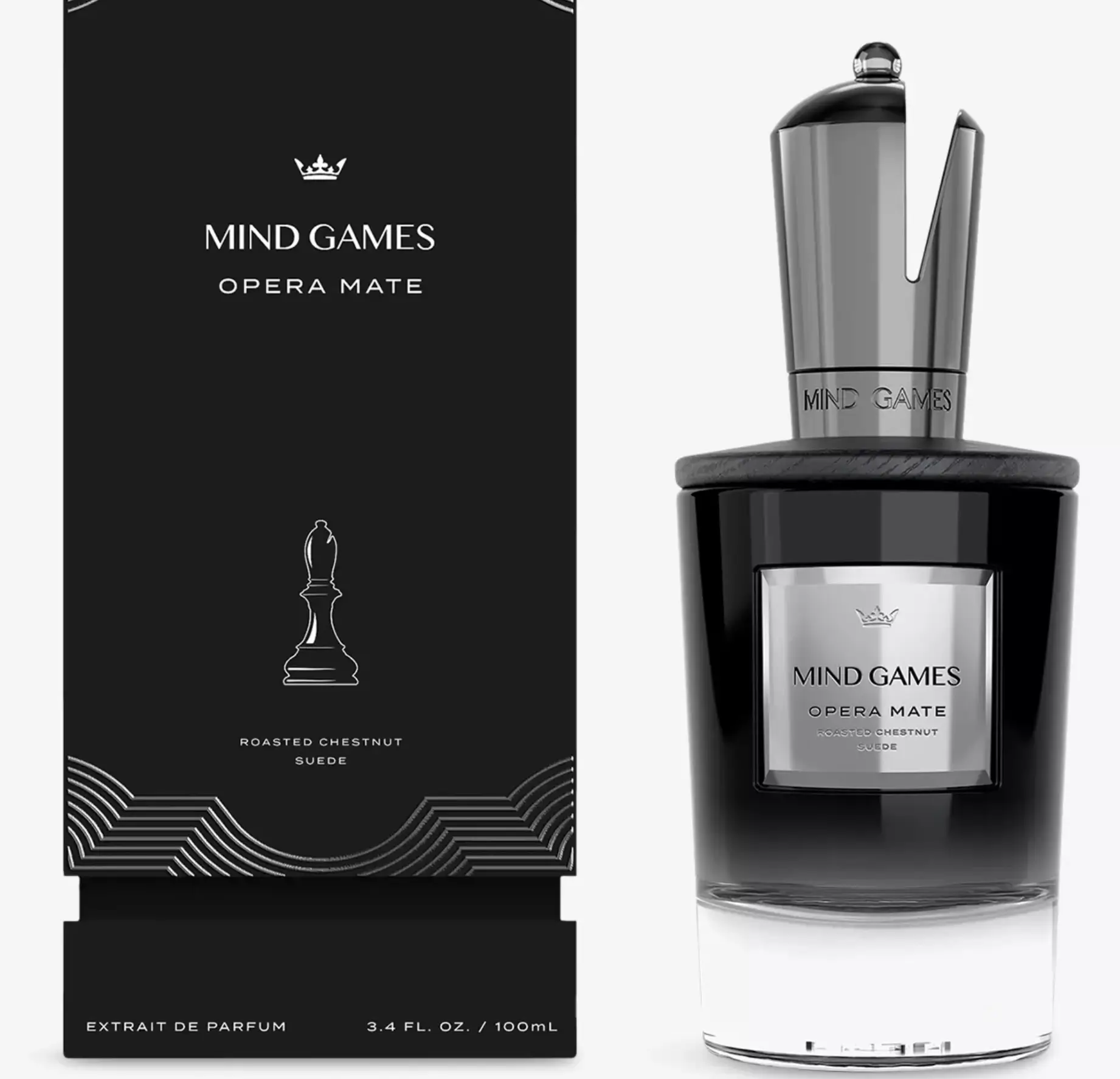 Much of Opera Mate’s allure lies in its presentation. The flacon — deep black glass fading into translucent clarity — resembles a piece of modern architecture more than traditional perfumery. The cap, shaped like a chess piece, is polished to a gunmetal sheen, engraved with the Mind Games crown insignia.