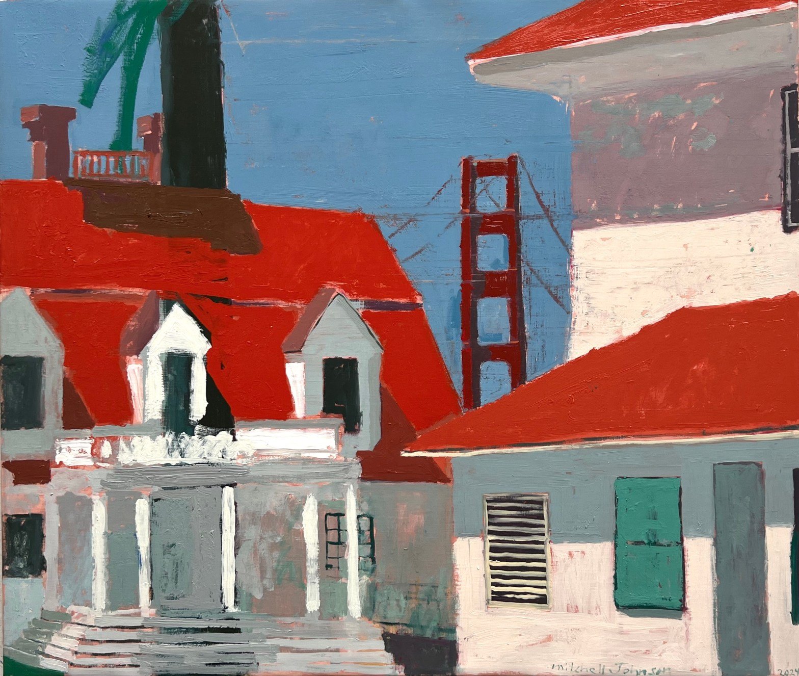 Mitchell Johnson, a renowned contemporary American painter, continues to captivate audiences with his distinctive use of color, geometry, and atmosphere. His recent work, Presidio #20 (Porch) (2024), is a testament to his evolving artistic journey, exploring the interplay between memory, place, and abstraction. This painting, like many of Johnson’s works, is rooted in his deep engagement with landscapes, architecture, and the emotional resonance of specific locations. In Presidio #20 (Porch), Johnson revisits themes of domesticity, light, and spatial harmony, presenting a visually compelling interpretation of the iconic Presidio area in San Francisco.