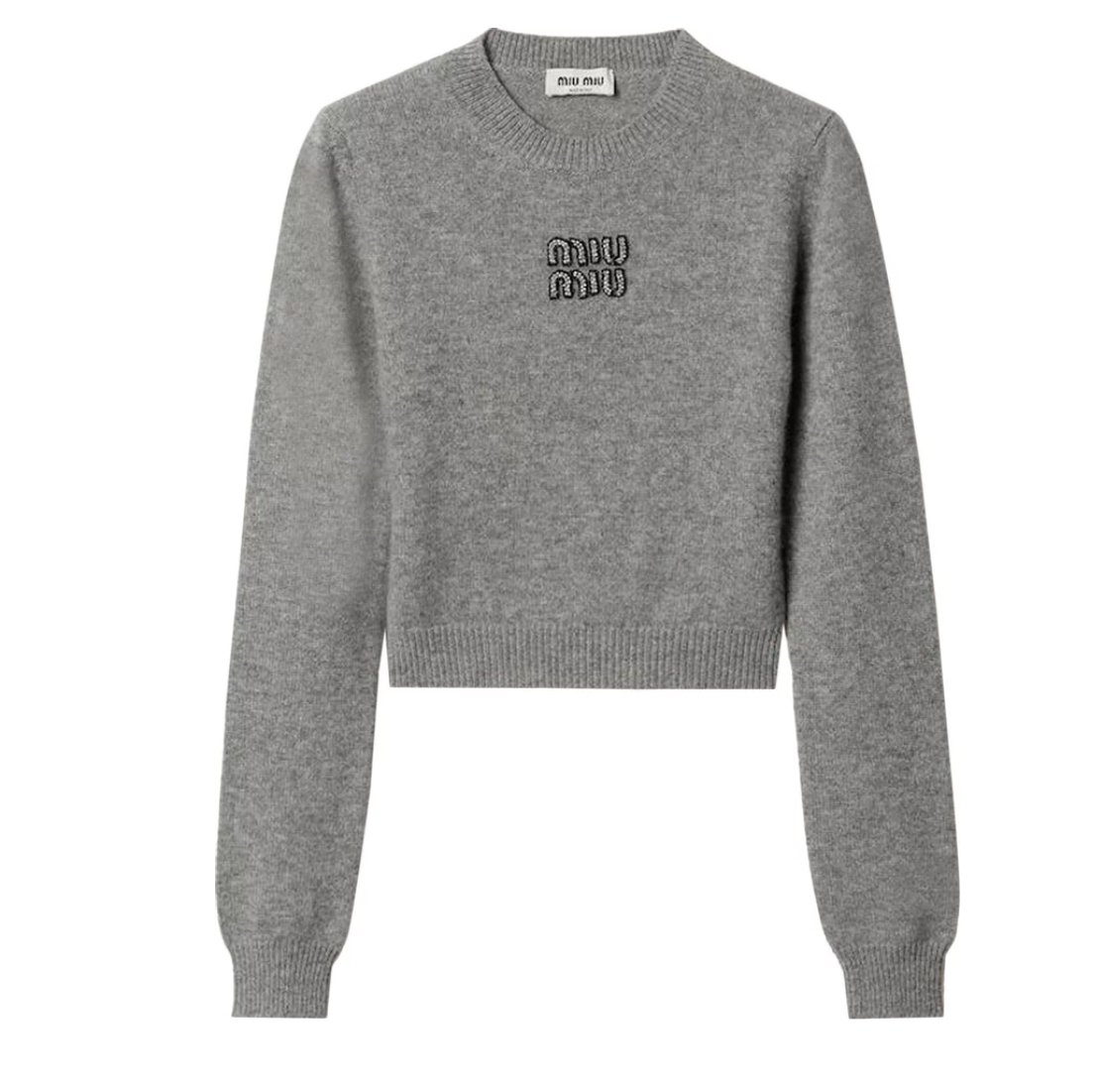 While Miu Miu is often associated with bold, playful designs, this sweater takes a more refined approach. The crew neck (girocollo) cut offers a classic silhouette that pairs effortlessly with various wardrobe staples, from high-waisted trousers to skirts or even more casual denim. The neutral gray shade allows for versatility, making it a perfect layering piece for both fall and winter seasons.