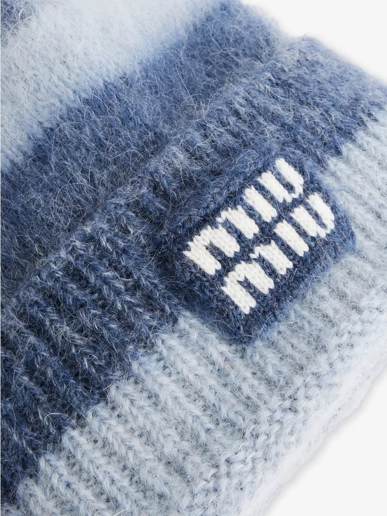 The defining feature is the striped pattern, rendered with a sense of restraint rather than excess. The stripes introduce a graphic rhythm that feels nostalgic without slipping into retro pastiche, echoing school uniforms, athletic knits, and archival youth culture references that Miu Miu frequently revisits. The color contrast is sharp yet wearable, making the beanie adaptable across a range of outerwear—from tailored wool coats to technical puffers or oversized bombers.