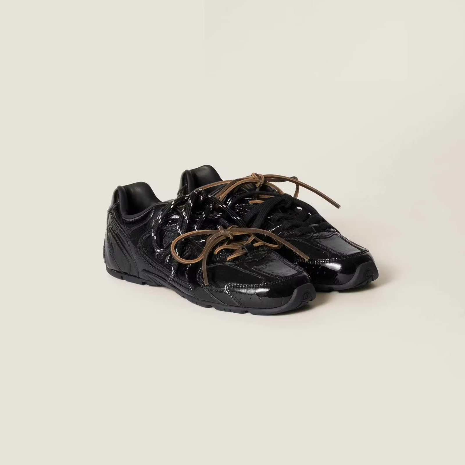 The upper is crafted from plush black patent leather, offering a glossy, high-shine finish that feels quintessentially Miu Miu. The material choice not only exudes luxury but also adds a tactile quality that contrasts sharply with traditional sneaker fabrics. The leather’s semi-collapsed look gives the shoe a lived-in elegance, striking a balance between refinement and casual cool.