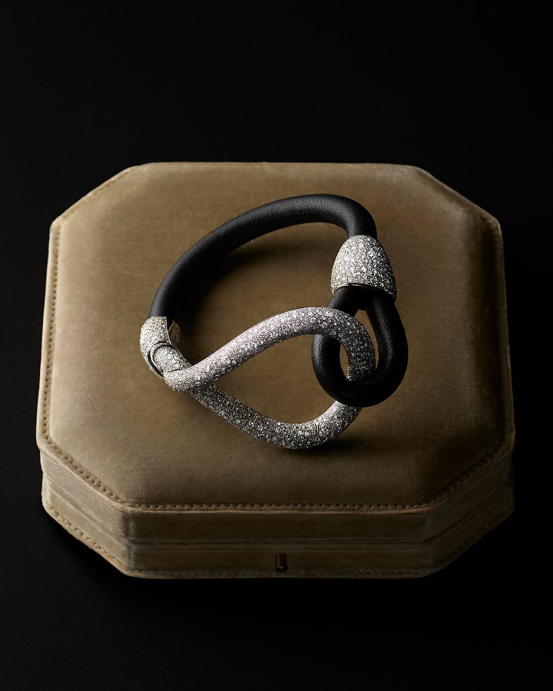 Pomellato has always had an instinct for gemstones, particularly those that are irregular, offbeat, and rich in personality. In ‘Monili’, this language evolves even further. Gucci’s influence introduces unexpected materials: chains of hand-woven leather, emerald cabochons set next to onyx beads, and rose gold woven with raw silk threads dyed in house colors.