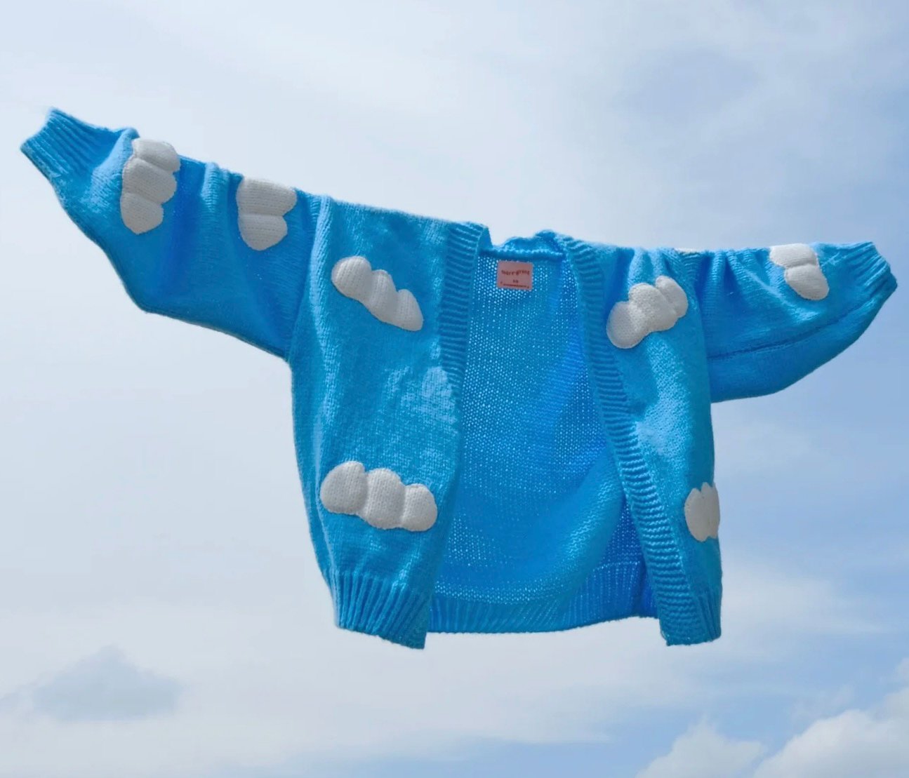 Floating somewhere between fashion and fairytale, Mure + Grand’s Cloudy with a Chance of Cuteness Puff Cardigan brings a burst of blue-sky optimism to your wardrobe. The knitwear piece captures the whimsy of a perfect spring day, with puffy white clouds drifting across a radiant sky-blue base. Crafted in a soft acrylic blend, it wraps wearers in comfort while radiating childlike joy and effortless charm.