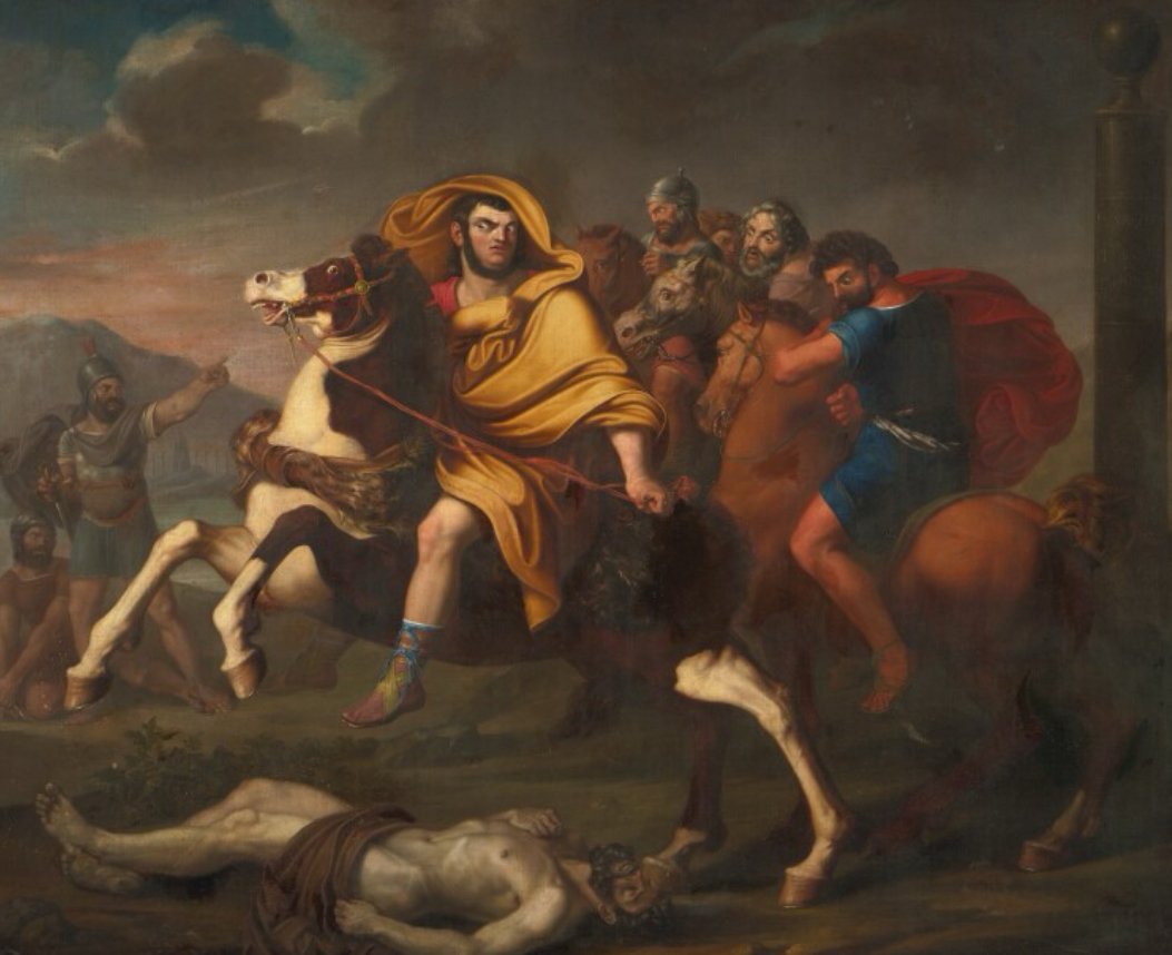 The French School’s penchant for dynamic compositions and flowing, almost theatrical arrangements would lend itself well to this subject matter. The figures in the painting might be arranged in a sweeping, diagonal composition, adding to the sense of movement and urgency. Horses rearing up, capes billowing in the wind, and frantic gestures—all hallmarks of 18th-century dramatic art—could be employed to create a scene of high emotion and physicality.