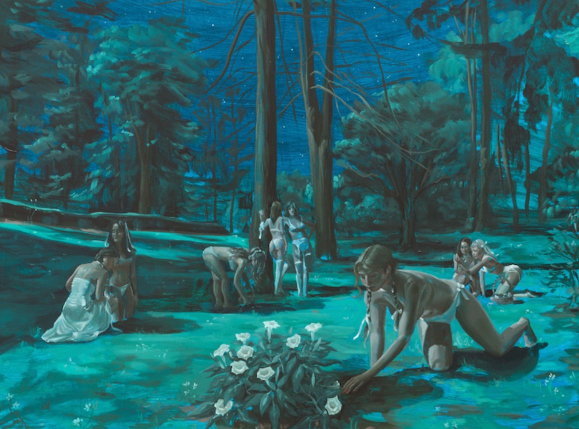 The final painting in the show is small—almost miniature compared to the rest. In it, a single figure stands at the edge of a lake, the surface of the water mirroring a starless sky. She is neither walking in nor turning back. She is simply there. Holding space. Holding time.