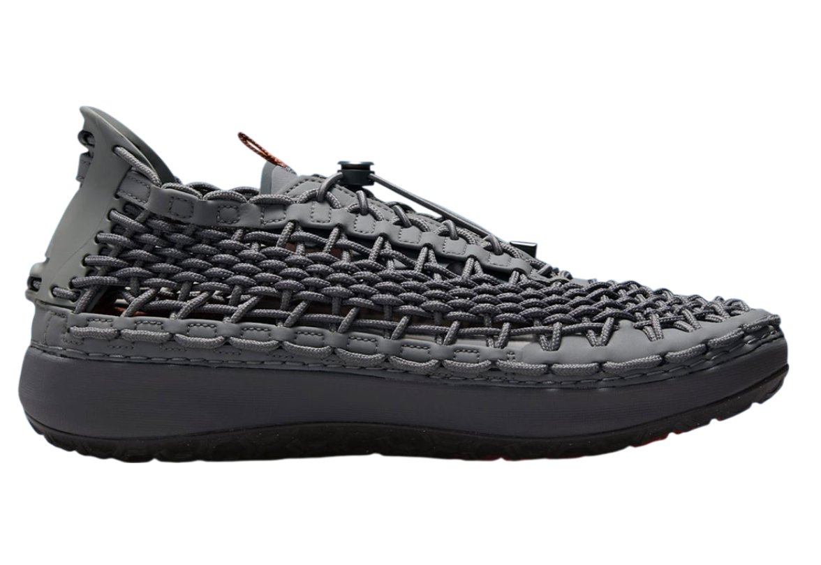 The upper is constructed entirely from woven cord, resembling a fisherman’s net more than a traditional shoe. This tight yet breathable interlacing adapts to the shape of the foot and dries quickly—ideal for aquatic activities and high-sweat conditions. Nike chose a zero-layer synthetic mesh base for reinforcement, allowing airflow while providing resistance to debris and mud. The Iron Grey hue is subtly reflective, catching light at certain angles and giving the shoe an industrial, almost cybernetic edge.