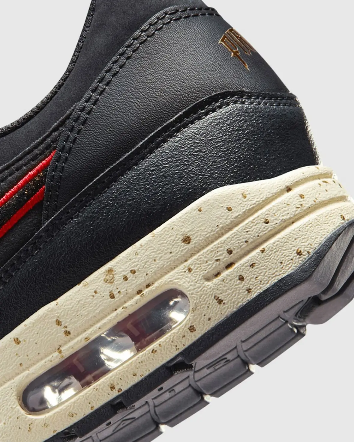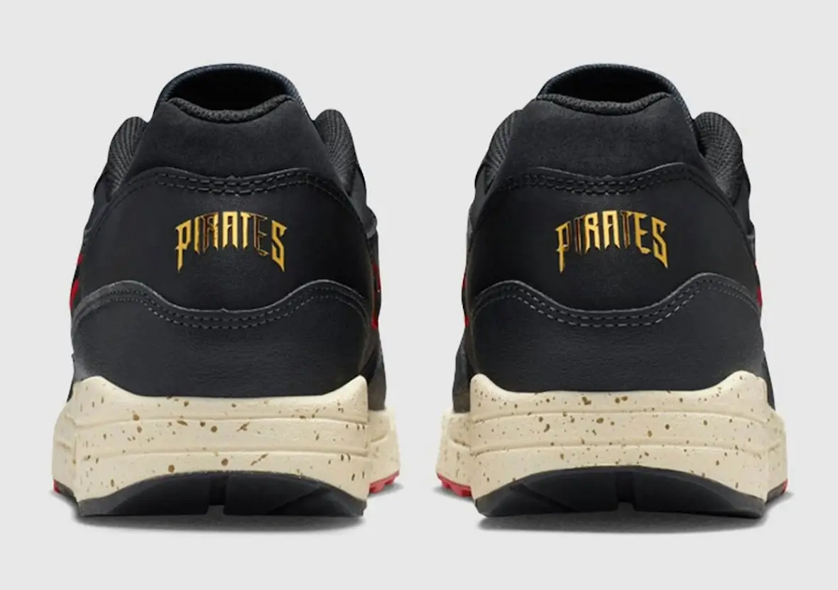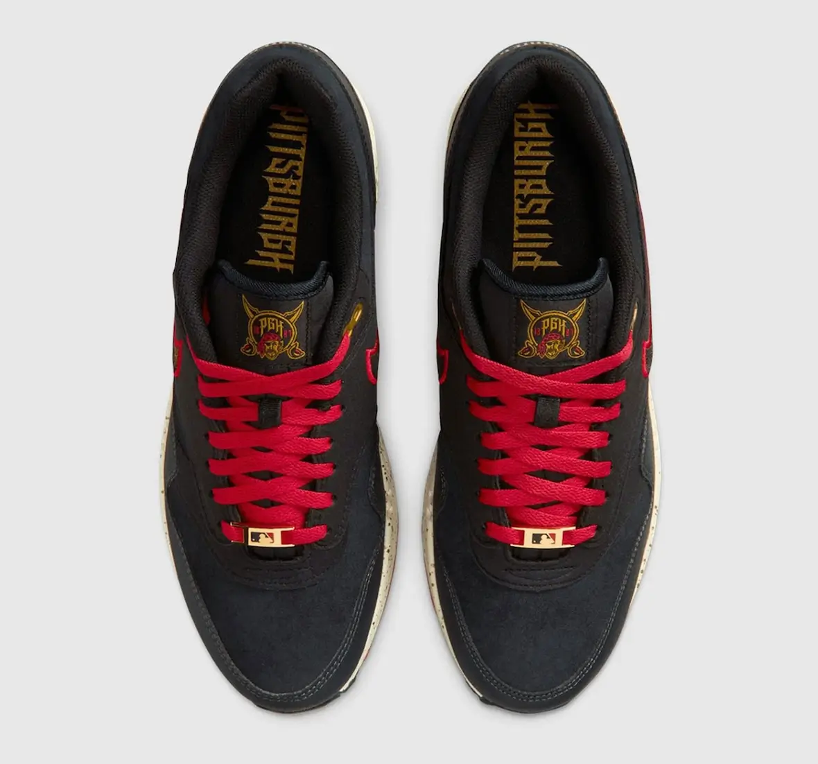 Just a black leather Air Max 1 with a gold Swoosh, burgundy lining, and the Pittsburgh Pirates’ tricorn hat stitched into the heel like a family crest.