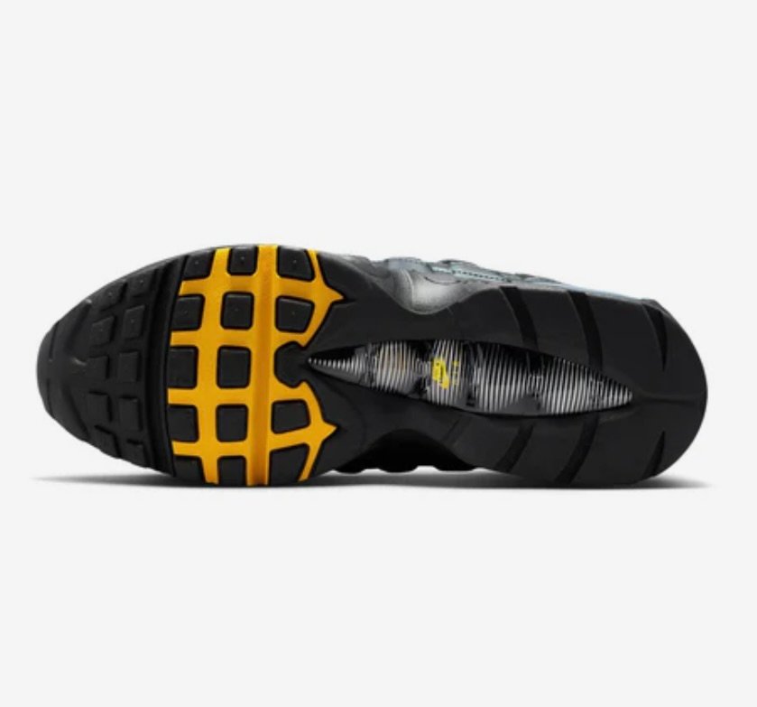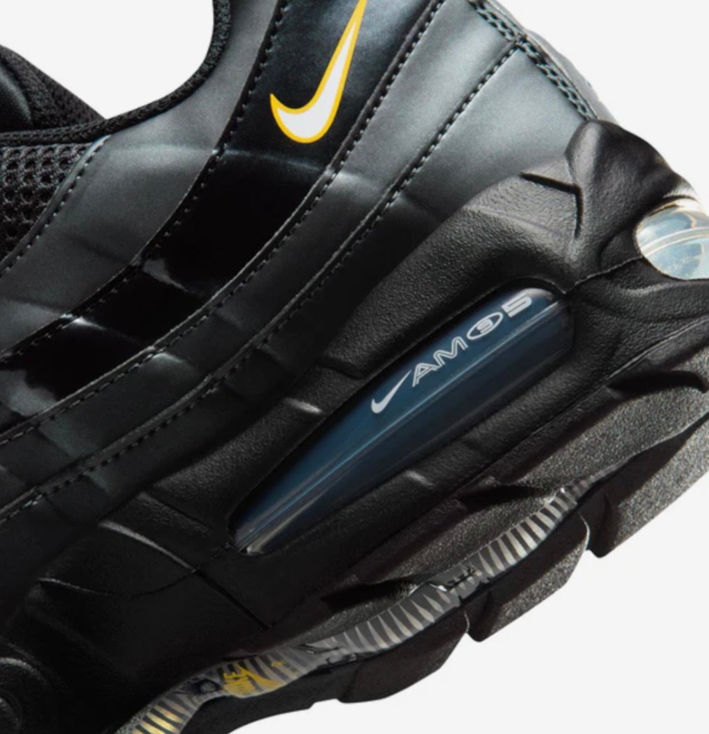 The Black / White – University Gold edition leans into the Air Max 95’s signature gradient aesthetic but introduces a bright pop of color that modernizes the classic silhouette.